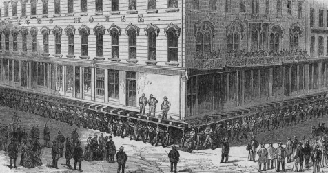 項(xiàng)目在1856年被認(rèn)可后,持續(xù)數(shù)年轟轟烈烈的城市改造。人們將建筑挖離地基后,用千斤頂一點(diǎn)點(diǎn)撬起來(lái),在下方建造新的支撐。1858年第一棟建筑被抬起,重達(dá)750噸,同年有50幾棟如此量級(jí)甚至更大的建筑被抬升重建。